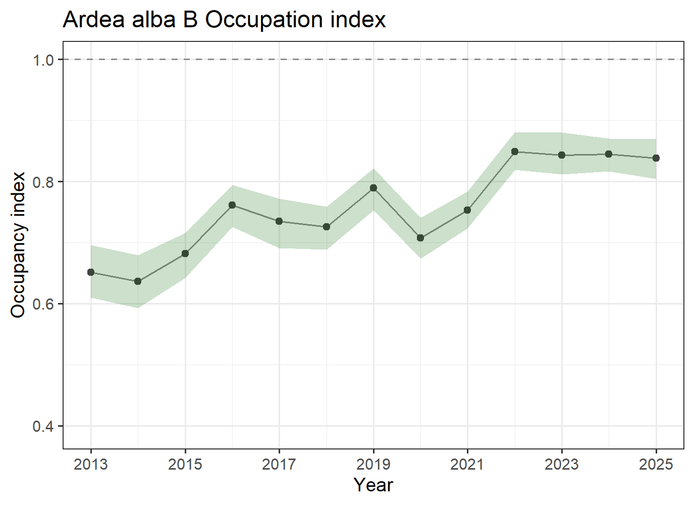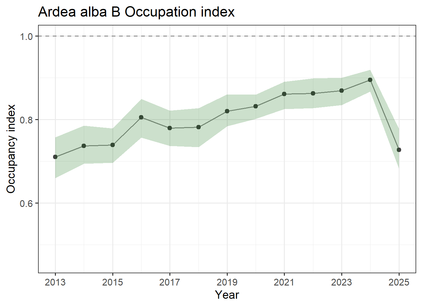 Sans entrer dans les détails de la méthode, le graphe ci-dessus montre l’expansion de la Grande Aigrette en tant qu’hivernant en Wallonie entre 2013 et 2025 (période de fonctionnement en plein d’Observations.be), bien qu’une forme de stabilisation soit finalement visible.