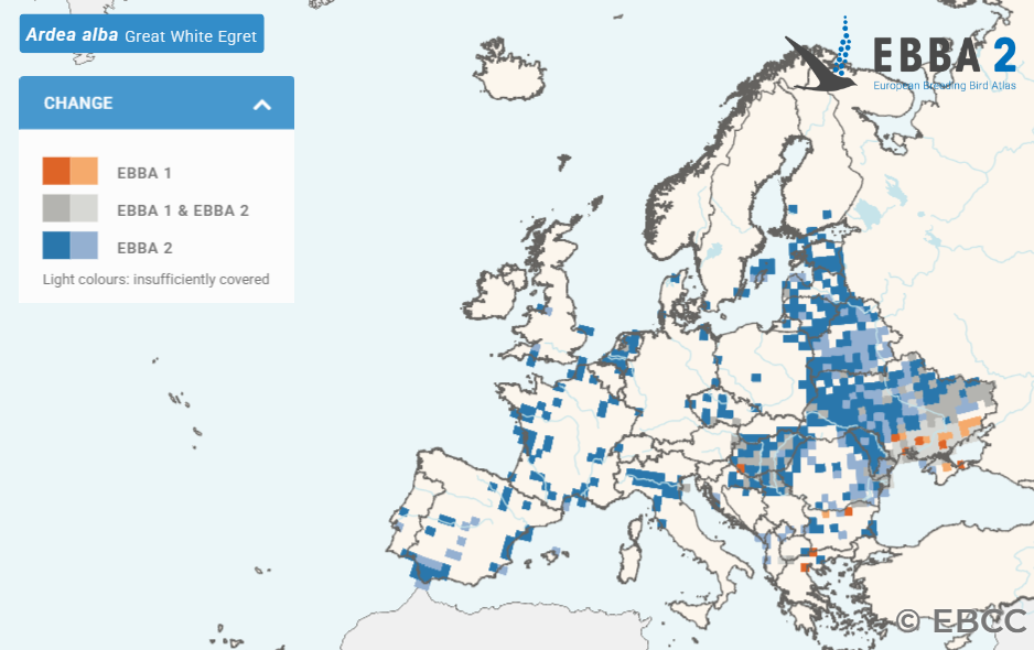 La carte ci-dessous, tirée de l’Atlas des oiseaux nicheurs d’Europe (EBBA), montre la progression spectaculaire de la Grande Aigrette entre les années 1980 (EBBA1) et les années 2013-2017 (EBBA2). Les carrés bleus sont ceux conquis par des nicheurs entre ces deux périodes.